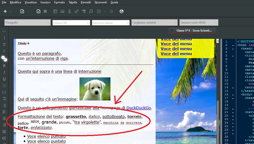 Allo stesso modo potete provare a fare click in qualsiasi altro punto della pagina e a inserire, spostare o cancellare quello che volete. Se andate più in basso nella home page potete vedere che vengono già mostrate alcune formattazioni del testo, come ad esempio parole evidenziate in grassetto, in corsivo, con sottolineature, ecc… Il tutto viene mostrato nella figura n. 2 qui di seguito: