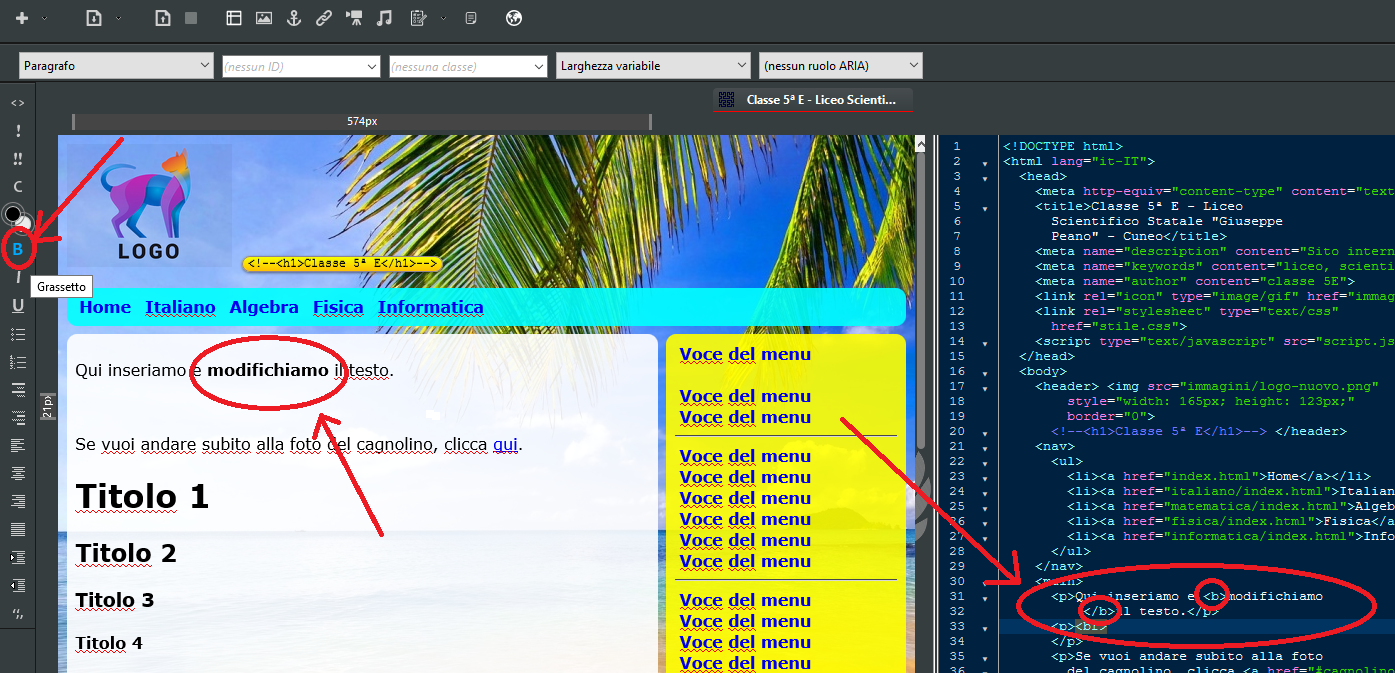 Come potete osservare nella figura n. 3, ora la parola che avevamo selezionato (cioè “modifichiamo”) appare effettivamente in grassetto evidenziata anch’essa da una seconda freccia rossa. La terza freccia rossa nella figura 3 segnala un altro piccolo cambiamento nel codice a destra. Ora, prima della parola “modifichiamo”, c’è un nuovo simbolo del linguaggio HTML che significa appunto “bold”, cioè “grassetto”.