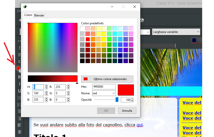 Scegliamo ora di colorare soltanto un’altra parola della frase, “testo” . Lo selezioniamo e poi andiamo di nuovo a cliccare con il mouse nella barra verticale a sinistra, come indicato dalla freccia a sinistra nella figura 4. Questa volta clicchiamo i due piccoli cerchi sopra alla “B” che ci aveva in precedenza evidenziato la parola “modifichiamo” in grassetto. Cliccando i due cerchietti appare una finestrella con la tavolozza dei colori fra i quali scegliere quello di nostro gradimento, come potete osservare sempre nella figura 4.