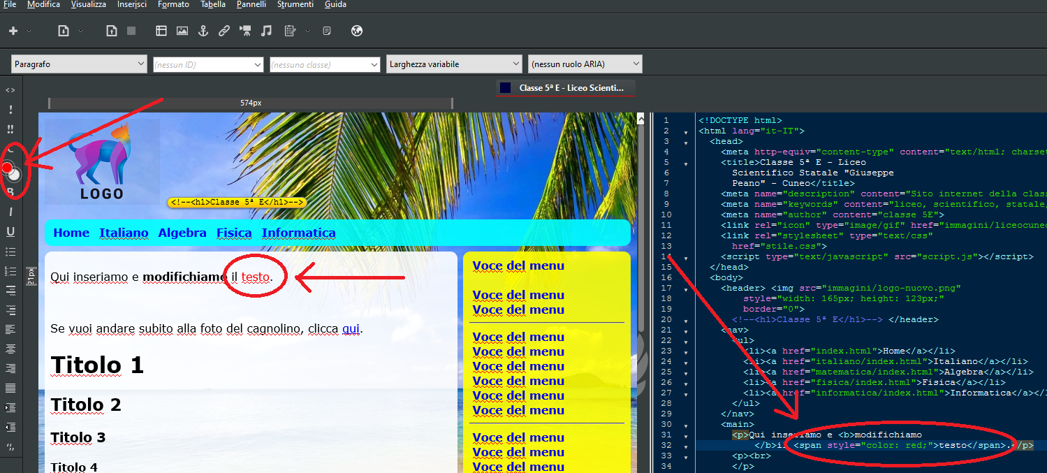 Nel nostro caso scegliamo il colore rosso, diamo OK e chiudiamo la finestrella dei colori. Possiamo così vedere che la parola testo (nella figura n. 5) è ora scritta in rosso come indicato dalla freccia rossa centrale e, come in precedenza, notiamo che nel codice a destra compare di nuovo qualche altro simbolo contemporaneamente alla nuova modifica effettuata a sinistra, in questo caso compare (come segnalato dalla freccia rossa a destra nella figura 5) la dicitura che in pratica significa, nei linguaggi HTML e CSS, che la parola testo è di colore rosso (“color:red;” come potete leggere nel codice evidenziato).